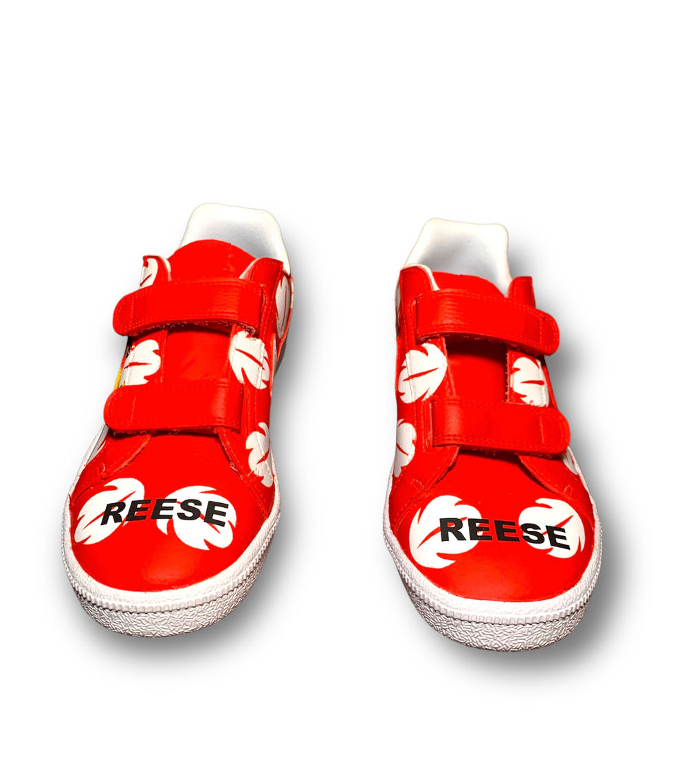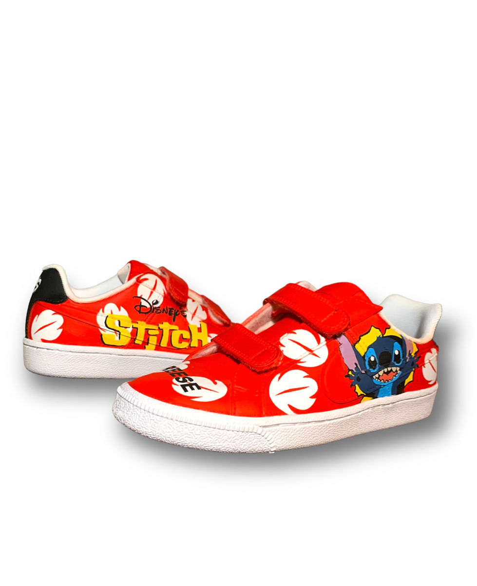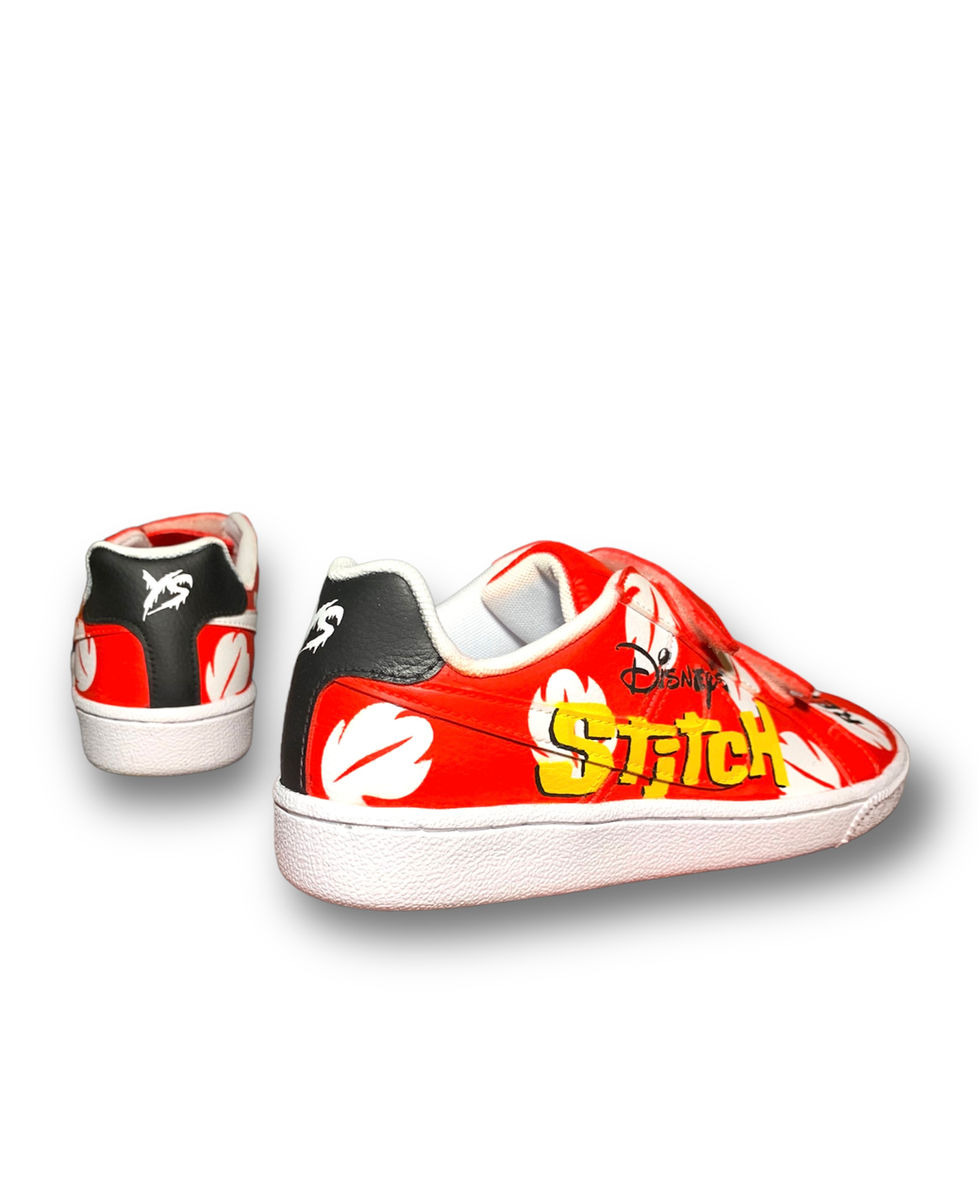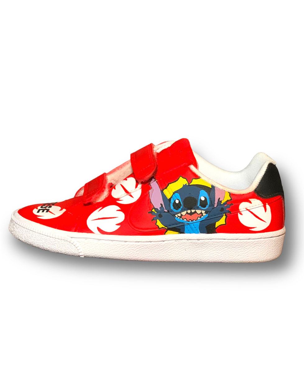 - Designs on Shoe: Lilo's dress pattern, portrait of stitch, and clients name "Reese"