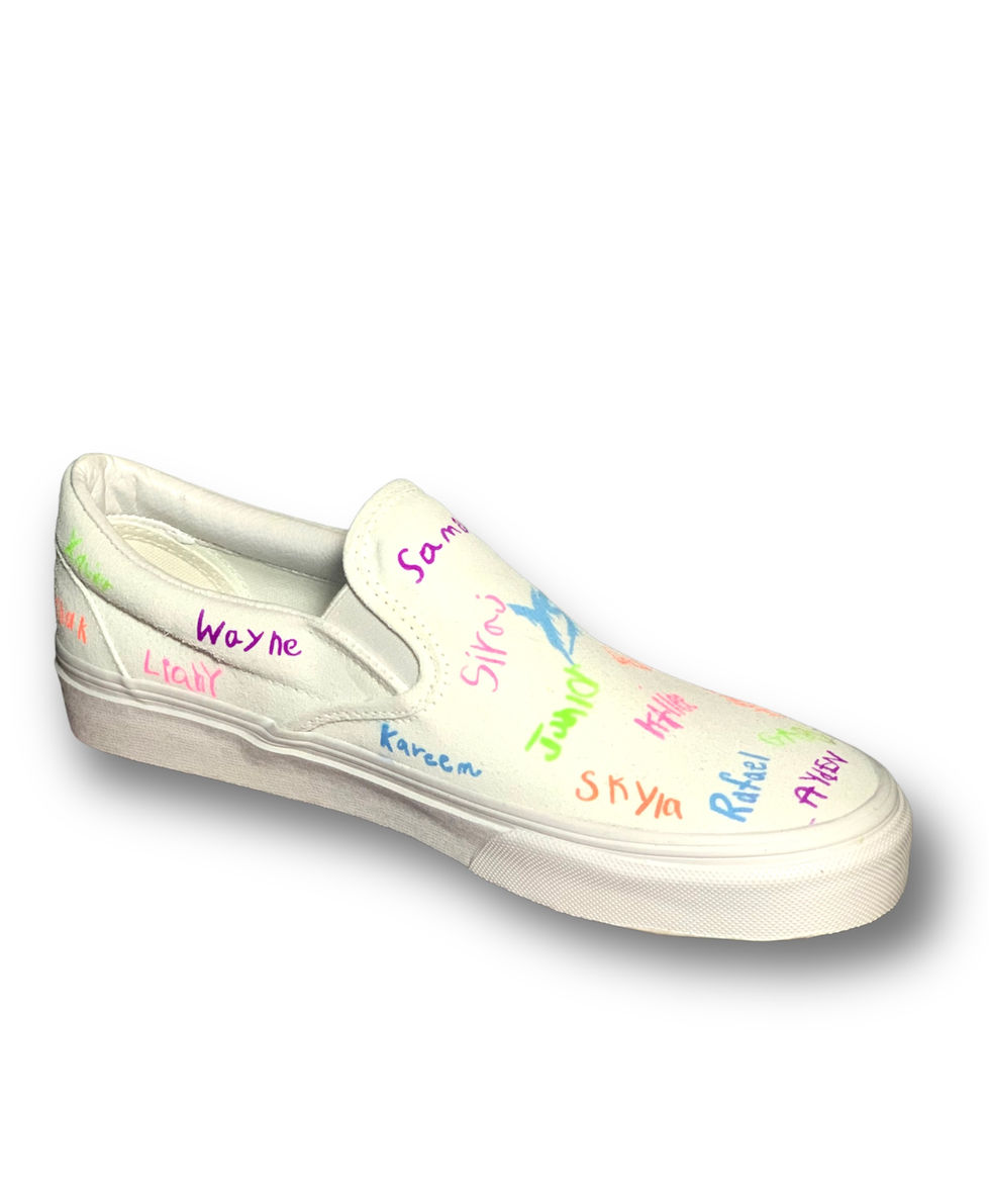 This project was for a passionate Elementary School teacher, Sarah Kelly. The shoe displays authentic signatures of her students.